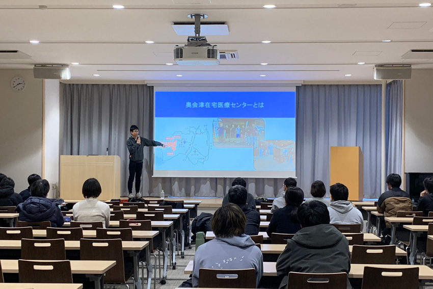 次に発表したのは、「地域と医療を考える」という講座。こちらは5名の生徒たちが参加。福島の奥会津地域でのフィ—ルドワークを通して、卒業生の支援も得ながら、診療医療に同行したり、行政へのヒアリングも行ったりしました。へき地医療のリアルについて触れるとともに、いかに課題を解決するかについて、国際的な医療まで視野を広げて研究した成果も発表されました。