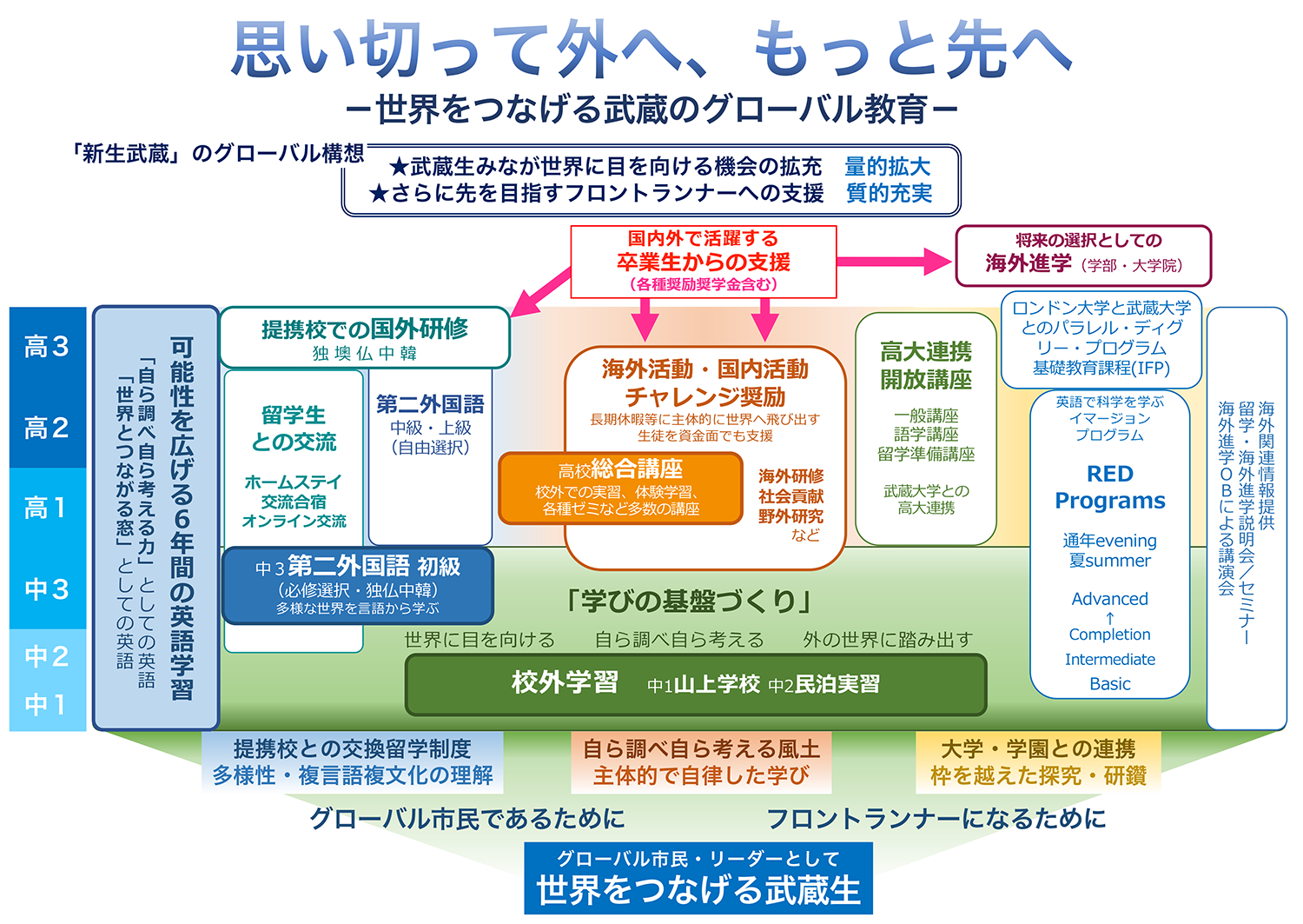 武蔵が目指すグローバル教育は、グローバル市民(地球市民)として生きる力の礎を築くことにあります。グローバル市民とは、世界に目を向け、地球規模で物事を捉え、考えることができる人であり、また、自らと異なる文化、思想、価値観を持つ人々を理解しようと努め、多様な社会のなかで力を合わせて進むことのできる人です。武蔵では、海外とつながることが自然に感じられる風土のなかでこうした素養を身につけ、さらに自らの課題を探究する活動が奨励されています。 グローバル市民となる生徒たちの「思い切って外へ、もっと先へ」という姿勢をさらに育むべく、「新生武蔵のグローバル構想」を策定しました。